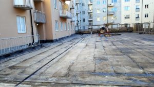 Entreprenaden omfattade rivning av överbyggnad ner till bjälklaget, pågjutning fallbetong, tätskiktsarbete, återuppbyggnad av innergården och renovering pelare samt målning av två parkeringsgarage.