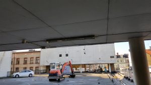 Entreprenaden omfattade rivning av ca 3000 kvadratmeter parkeringsdäck bland boende och pågående affärsverksamhet i underliggande butiker.